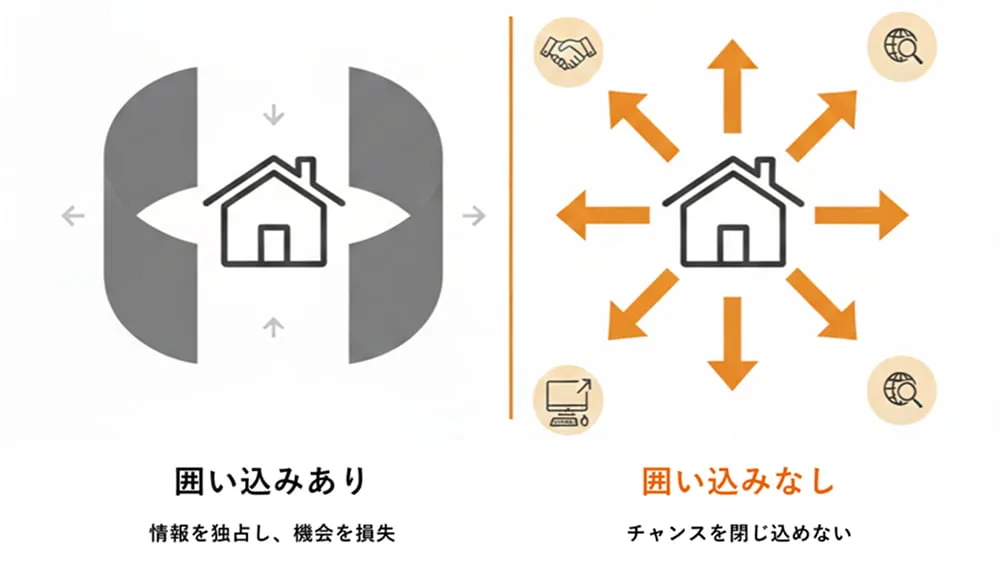 囲い込みとは、他社への情報公開を制限し、自社の買主だけに販売しようとする手法のことです。買主にとって選択肢を狭め、売主にとっては販売機会を失うリスクになります